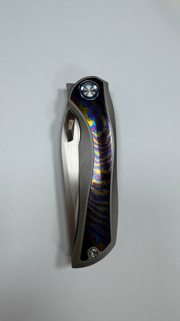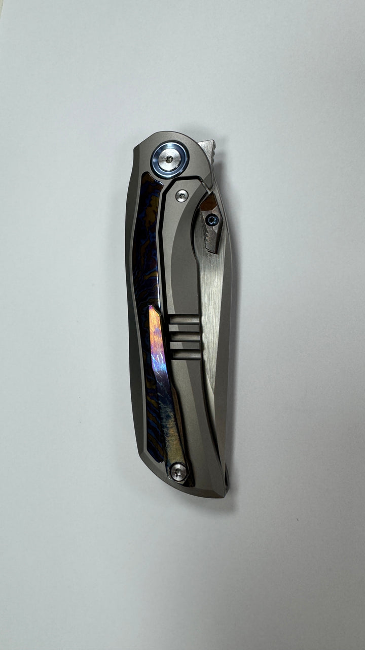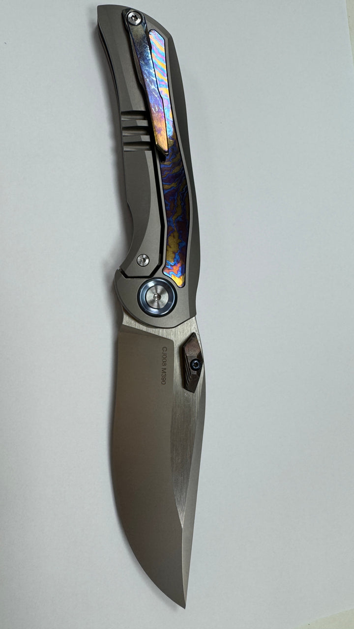 This is a titanium alloy outdoor half-in-one folding knife. The blade material is M390 stainless steel, the patch is titanium horse, and the wire lock structure